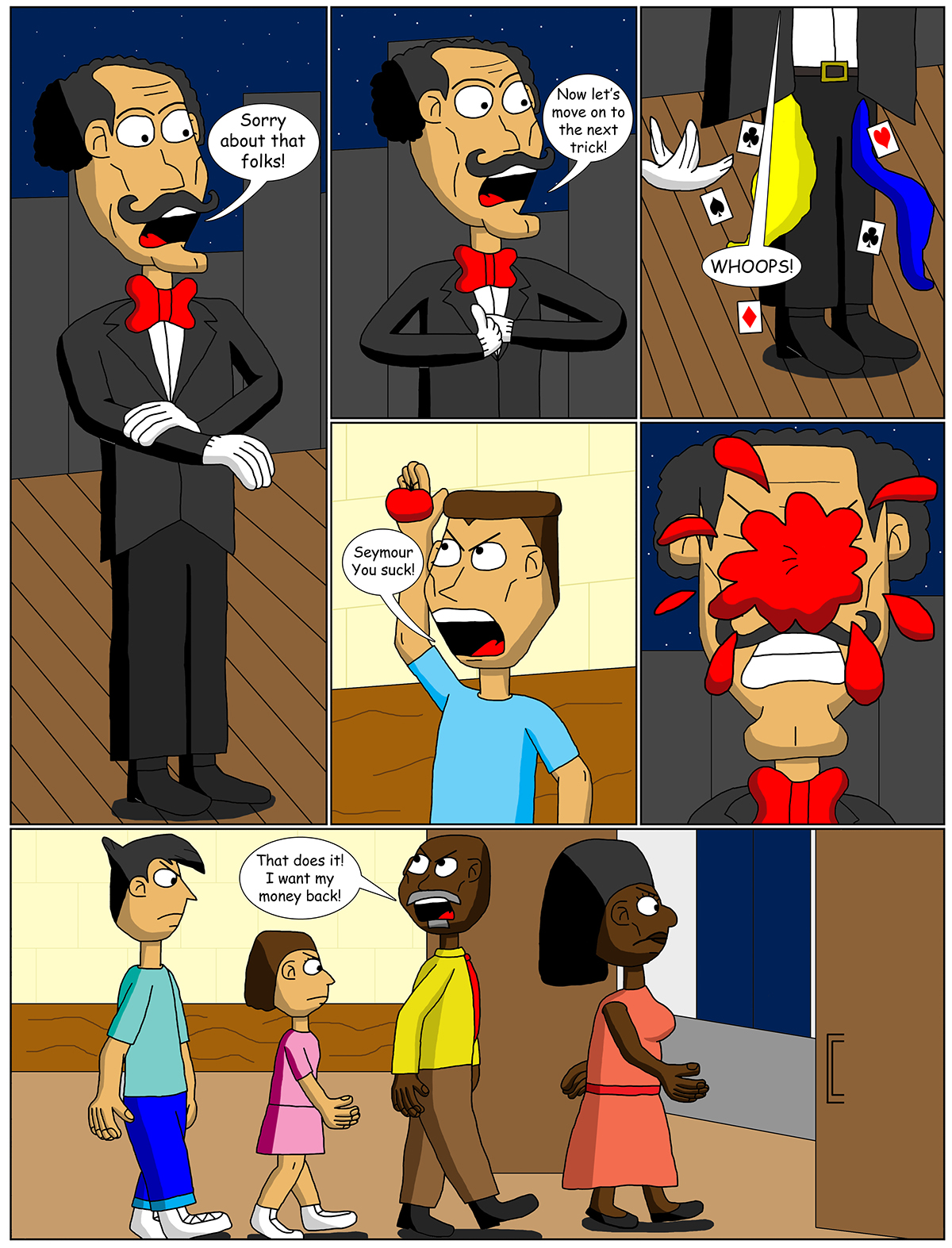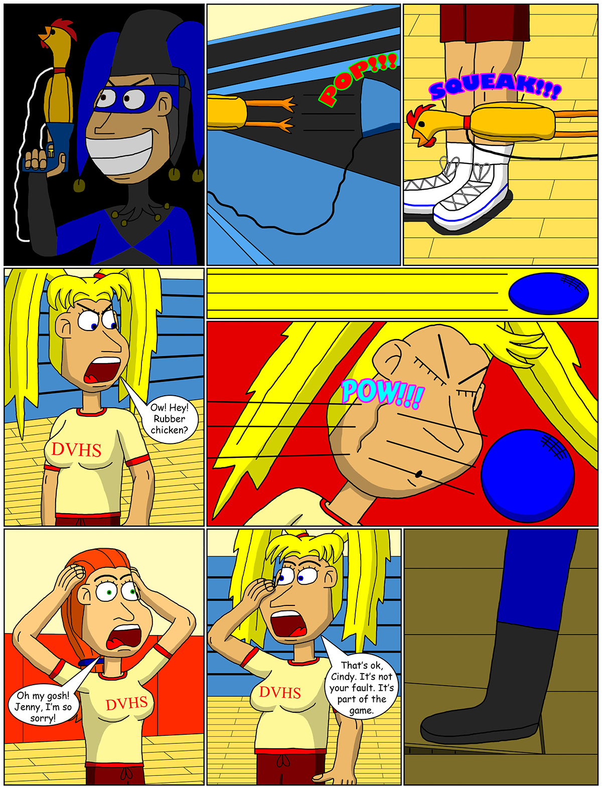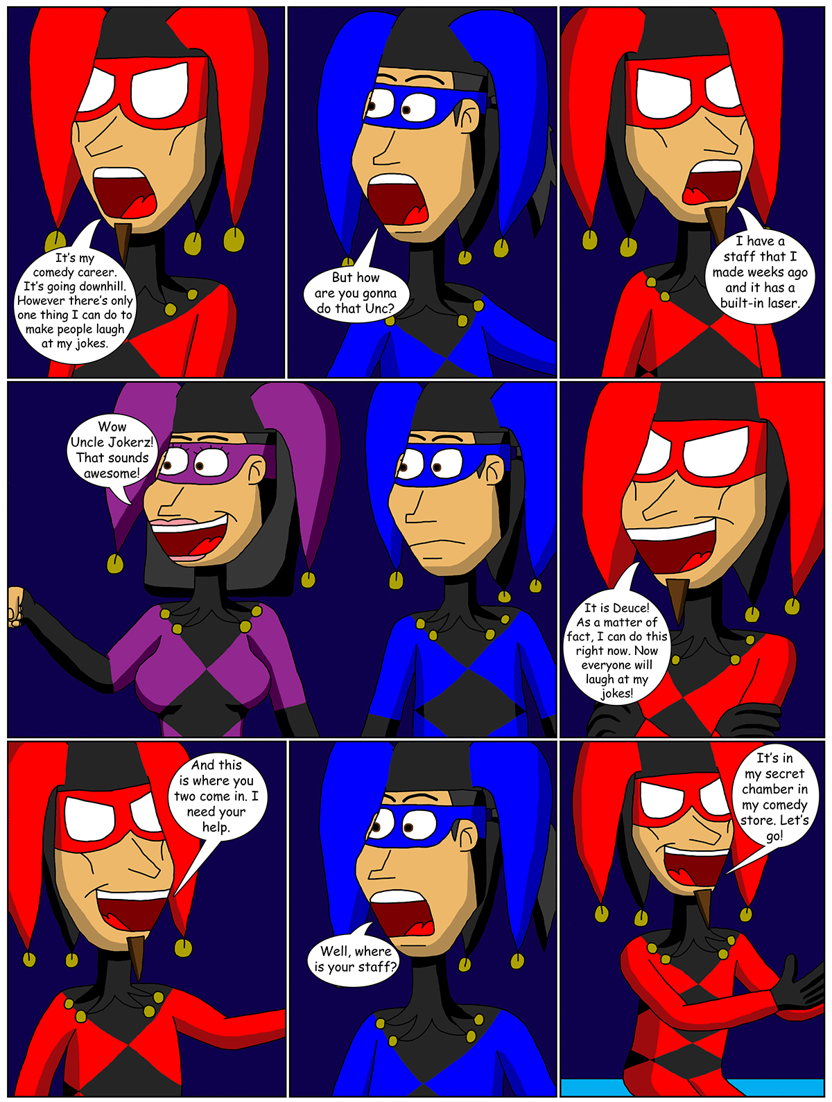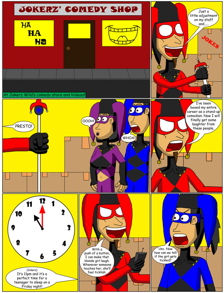 A court jester known for his lousy comedy and offensive jokes uses his staff to make everyone in the city of Dodgeville laugh with him for his amusement. He also hires two assistants working for him.